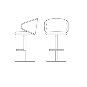 Swivel and self-aligning stool. Chromed or painted frame. Diam. 45 cm base. Beech plywood seat and backrest with flame-retardant polyurethane foam, upholstered.