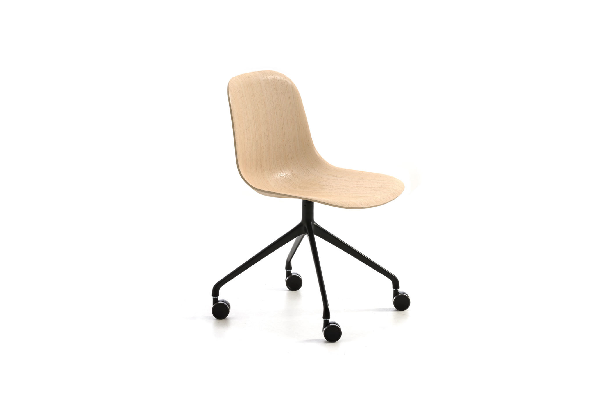 Home-office chair with polished or painted aluminum 4-spoke not-swivel base base and 3D basic veneer shell. Fixed cushion available.