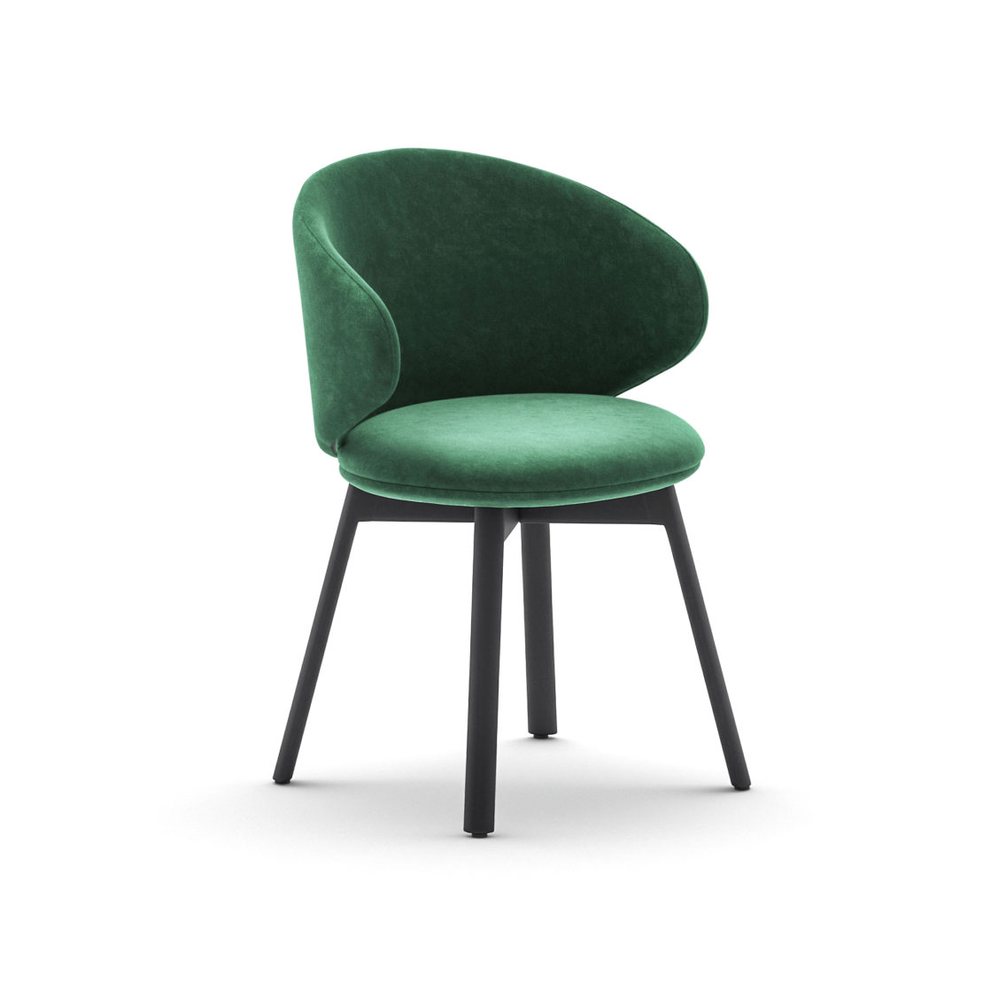 Belle is a collection of chairs and stools designed for contract spaces. It features a round seat and curved, wraparound backrest that embraces the body. Completely upholstered, Belle is customised through its finishes and bases to suit different environments – from restaurants and bars to workplaces. The chair version is available with four wooden or metal legs, sled base or swivel base with casters and trestle; the stool with metal legs, central column with adjustable support or swivel wooden trestle base