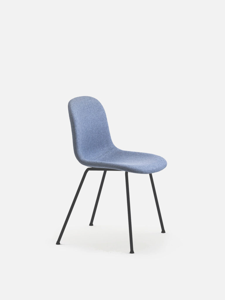 Poltroncina 4 gambe con fusto in acciaio e scocca in multistrato di faggio tappezzata con espanso ignifugo.