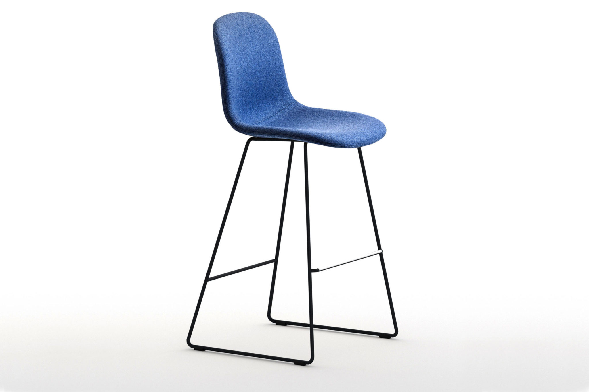 Sgabello con fusto a slitta in acciaio e scocca in polipropilene con espanso ignifugo tappezzato.