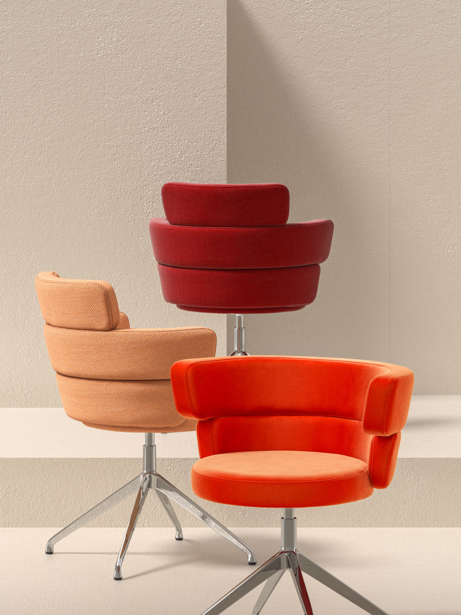 R. Per rendere ancora più performante ed ergonomica la poltroncina e per spingere anche lo sgabello nella direzione fashion suggerita dai nostri partner, gli architetti. Entrando nello specifico, alla poltroncina è stato aggiunto un terzo anello che conferisce maggiore supporto alla schiena; un comfort maggiore adatto a trascorre più ore nella stessa posizione come accade nelle sale meeting e nelle aree lavoro di un tipico ambiente corporate, ma non solo. Lo sgabello, che prima contava su un unica base centrale piuttosto tecnica, ora viene accompagnato da una versione con base in legno girevole, più calda e versatile, che può essere personalizzata scegliendo tra molte essenze e finiture, così che gli interior designer possano godere di una possibilità in più.