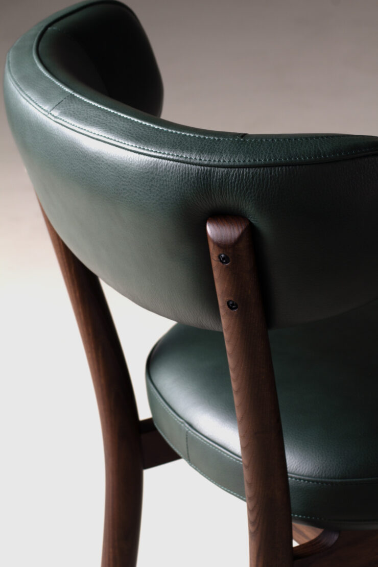 Una seduta avvolgente, rivestita in tessuto animalier -Kvadrat Tablu- a rilievo.